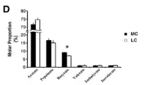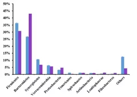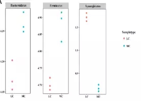 在細(xì)菌門(mén)水平,一共有14個(gè)原核的門(mén)被鑒定,主要是厚壁菌門(mén)(35.7-30.1%),擬桿菌門(mén)(26.6-43.6%)、互養(yǎng)菌門(mén)(11-7%),且通過(guò)門(mén)水平維恩圖分析發(fā)現(xiàn),在兩組(MC和LC)間門(mén)水平組成相同,比較分析兩組間微生物變化情況發(fā)現(xiàn)(如圖:FIG2),MC組相比于LC組,互養(yǎng)菌門(mén)增長(zhǎng)了57%,無(wú)壁菌門(mén)增長(zhǎng)了330%。而黏膠球形菌門(mén)降低了63%,纖維桿菌門(mén)降低了65%;
