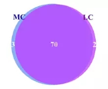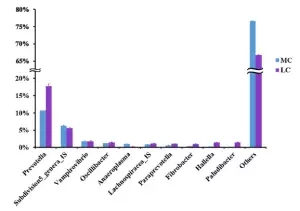 在細(xì)菌屬水平。共鑒定出75個(gè)屬水平細(xì)菌,在兩組間共有70個(gè)屬,在MC組有三個(gè)特有的屬,在LC水平有2個(gè)特有的屬,普氏菌屬(10.4-17.9%)在兩組間都為主要屬水平的菌。