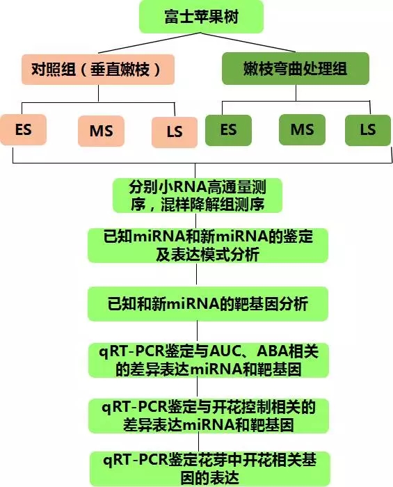 生長(zhǎng)六年大小的富士蘋(píng)果樹(shù),分兩組進(jìn)行嫩枝彎曲(110度)、對(duì)照處理(垂直嫩枝),分別在開(kāi)花誘導(dǎo)的初期(early stage,ES)、中期(Middle stage,MS)和晚期(Later stage,LS)取花芽,分別提取RNA進(jìn)行小RNA測(cè)序,6個(gè)花芽組織RNA混樣進(jìn)行降解組測(cè)序。