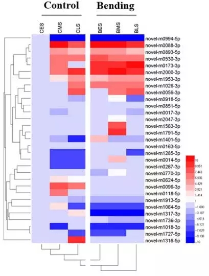 對(duì)嫩枝彎曲處理組和對(duì)照組間的31個(gè)差異表達(dá)新miRNA進(jìn)行表達(dá)層次聚類(lèi)分析。結(jié)果顯示,根據(jù)表達(dá)模式可分為5個(gè)亞簇。其中Cluster 1中的6個(gè)新miRNA在嫩枝彎曲組表達(dá)量均高于對(duì)照組。Cluster 5中的新miRNA表達(dá)模式則與Cluster 1中相反。其他三簇中的19個(gè)新miRNA,無(wú)論在對(duì)照組還是嫩枝彎曲處理組,展現(xiàn)出較低的表達(dá)水平。