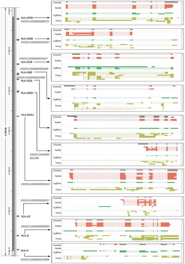 Figure 4.基因通過(guò)PacBio所測(cè)轉(zhuǎn)錄本和組裝得到的轉(zhuǎn)錄本還原10個(gè)MHC基因。染色體定位、命名和每個(gè)基因的Ensembl編號(hào)(在左側(cè))。