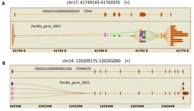 Figure 2. 三代測(cè)得轉(zhuǎn)錄本的不同isoforms,在數(shù)據(jù)庫(kù)中的參考基因模型如圖示中被標(biāo)記有染色體位置、基因ID和基因名稱