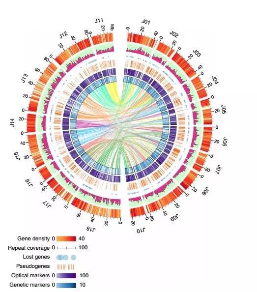 然后利用遺傳圖和光學(xué)圖譜對A、B亞基因組進(jìn)行區(qū)分,整體掛載效果非常好,A為91.48%,B為72.32%。利用光學(xué)圖譜和遺傳圖譜對基因組進(jìn)行區(qū)分,為其他多倍體物種基因組研究提供了參考。