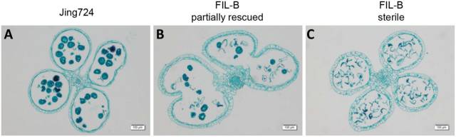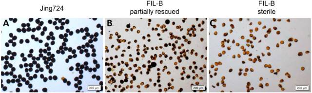1、育性分析:FIL-B(育性不穩(wěn)定系)分為育性部分恢復的植株和完全不育植株,本項目所構建的BC4群體462個子代中有14.9% 的植株為育性部分恢復的表型。育性部分恢復植株的花粉大小小于正?;ǚ?,大于完全不育植株的花粉(Fig 1.)。經I2-KI染色后的不育花粉表現出形態(tài)的不規(guī)則和染色的異常(Fig 2.)。