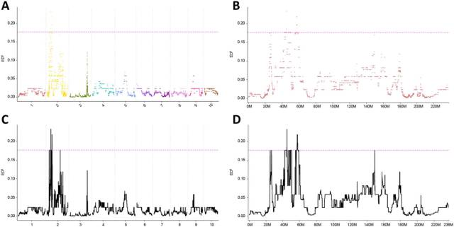 A: 各染色體上SNP的ED值; B: 2號染色體上SNP的ED值;C:各染色體上SNP經擬合后的關聯(lián)分析結果;B: 2號染色體上SNP經擬合后的的關聯(lián)分析結果,其中紅色的虛線代表閾值線(99百分位法計算得到),黑色的實線代表擬合曲線
