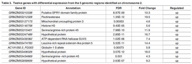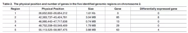 4、BSR關聯(lián)分析:與參考基因組比對后,F池和S池分別獲得171,594和 170,820個 SNP,選取混池間差異的SNP位點,進行ED關聯(lián)分析,共得到5個候選區(qū)域(Fig 4.),結合數據庫注釋結果及轉錄組差異基因的結果,最終獲得12個候選基因(Table 2、Table 3)。