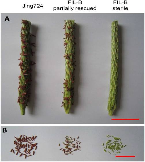 A:Jing724 和FIL-B (育性不穩(wěn)定系,包括育性部分恢復植株和完全不育植株) 在抽穗6天后的穗;B: A圖中各植株穗上的花粉. 其中紅色的標尺代表 3 cm