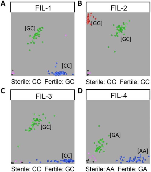 本研究選取BC4群體中50株育性部分恢復植株和50株不育植株,分別提取DNA,對候選的兩個蛋白基因共4個SNP位點進行KASP驗證,發(fā)現在不同的表型下會出現不同的基因型,再次暗示這兩個基因很可能是與育性不穩(wěn)定相關。