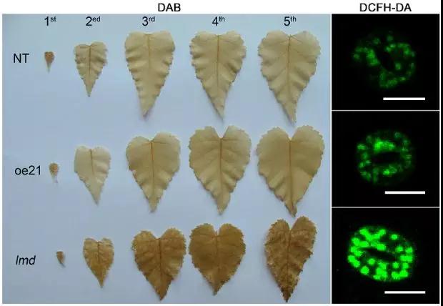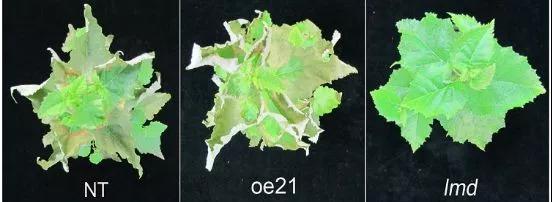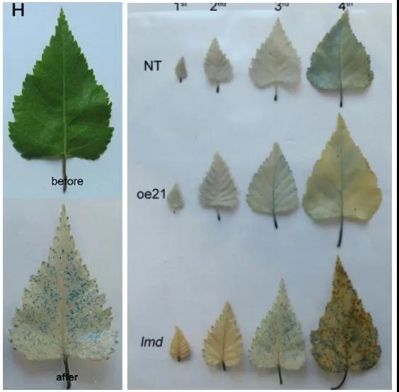 作者在研究BpGH3.5在樺樹中的功能時偶然獲得了lmd突變體。構(gòu)建的21株OE-GH3.5株系中,唯獨(dú)lmd葉片表現(xiàn)出壞死斑點(diǎn)并伴有早衰的現(xiàn)象。這很明顯是一種病變的表現(xiàn),當(dāng)這種情況出現(xiàn),很顯然我們要思考兩個問題: