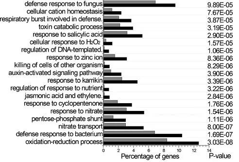 為了深入了解lmd體內(nèi)的分子水平變化,作者進(jìn)行了轉(zhuǎn)錄組測序。對差異基因進(jìn)行分析發(fā)現(xiàn)了許多與致病相關(guān)的基因,如WRKY、谷胱甘肽-轉(zhuǎn)移酶(GST)、乙烯反應(yīng)因子(ERF)和絲氨酸/蘇氨酸蛋白激酶(serine/threonine-protein kinase),這些都已經(jīng)被研究證實(shí)與防御反應(yīng)相關(guān)。GO富集分析顯示,參與催化活性、抗氧化活性、免疫系統(tǒng)過程和刺激響應(yīng)的差異基因發(fā)生了顯著富集(圖9)。