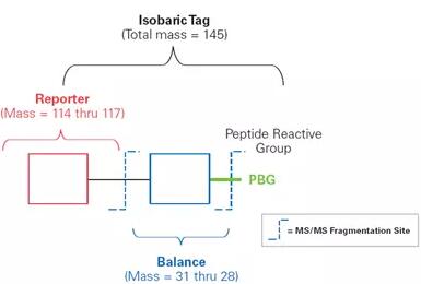 iTRAQ試劑由三部分組成:報告基團(tuán);質(zhì)量平衡基團(tuán)和肽反應(yīng)標(biāo)記試劑基團(tuán),可形成4種或8種相對分子質(zhì)量均為145的等量異位標(biāo)簽。