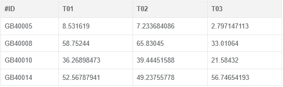 默認(rèn)首行、首列為表頭,一般每列表示一個(gè)樣品,每行表示一個(gè)基因,也可統(tǒng)計(jì)其他含義的數(shù)據(jù)矩陣。除表頭外,參與統(tǒng)計(jì)繪圖的內(nèi)容應(yīng)為純數(shù)字,文件范例如下: