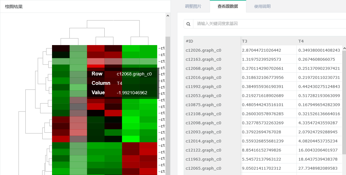 c 選中行聚類(lèi)樹(shù)某分枝后,可在“查看原數(shù)據(jù)”也篩選出對(duì)應(yīng)行并下載。