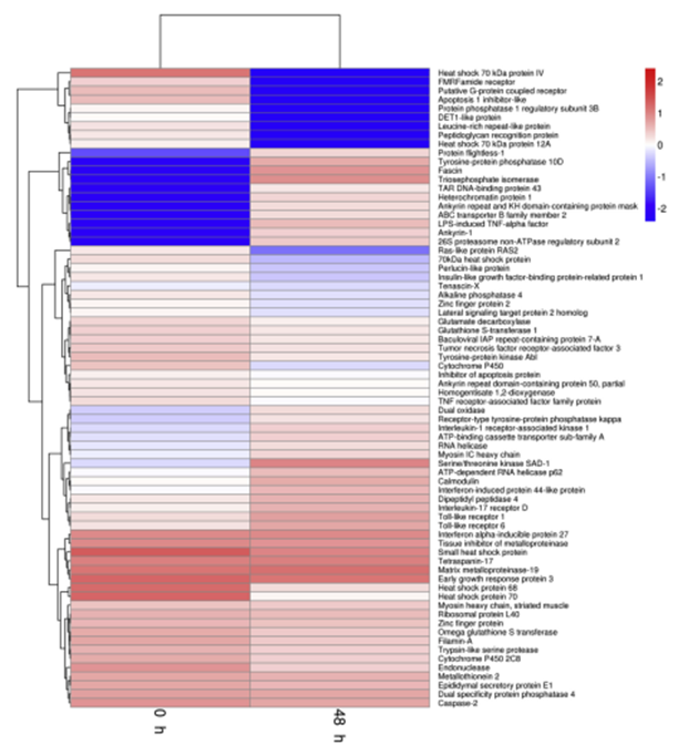 2017年,中國(guó)水產(chǎn)科學(xué)院喻達(dá)輝老師在百邁客云平臺(tái)上對(duì)合浦珠母貝免疫相關(guān)數(shù)據(jù)進(jìn)行分析,2篇文章(合浦珠母貝)先后分別發(fā)表于同一個(gè)雜志《Fish & Shell?sh Immunology》,這兩篇文章中都進(jìn)行了聚類(lèi)熱圖分析。第一篇文章中研究人員將免疫相關(guān)差異表達(dá)基因按照不同時(shí)期進(jìn)行分層聚類(lèi)分析,第二篇文章中研究人員將不同時(shí)期的unigene進(jìn)行了聚類(lèi)熱圖分析,為后續(xù)研究結(jié)果的呈現(xiàn)做了較好的鋪墊作用。