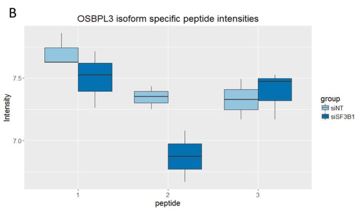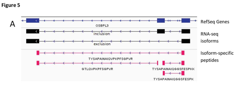 約65%的顯著差異表達的splice-specific-peptides在RNA水平上表現(xiàn)出一致的表達差異。例如,下調(diào)SF3B1的實驗組中,OSBPL3 9號外顯子中分別有3個支持外顯子保留和1個支持外顯子去除的peptides被鑒定出來。兩種inclusion specific-peptides表達明顯較低,而exclusion specific -peptides則與對照相比表現(xiàn)出較高的表達量(如圖5所示)。