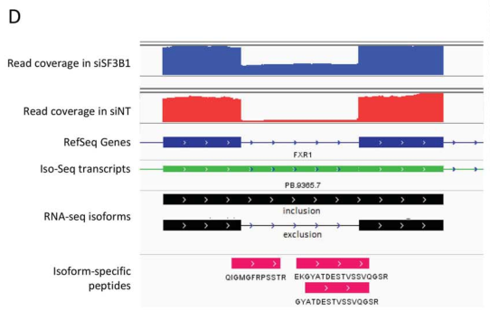 例如,全長轉(zhuǎn)錄本進行測序結(jié)果支持FXR1內(nèi)含子保留的三種肽段,因此這種內(nèi)含子保留事件也存在于注釋文件中。Illumina 測到的短 reads支持這一事件,并提供了定量的證據(jù),表明它在SF3B1的下調(diào)過程中比其對照組(圖6D)更高表達。