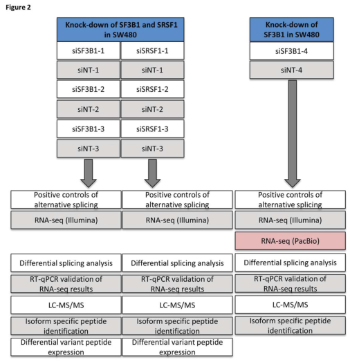 為了測試splicify這種蛋白組學(xué)數(shù)據(jù)的分析方法,建立了一種可以對isoform變化進行調(diào)控的實驗?zāi)P?,對SW480結(jié)腸癌細胞系中的剪接因子SF3B1和SRSF1進行siRNA干擾以下調(diào)其表達,然后通過RNA-seq和質(zhì)譜進行結(jié)果檢測。