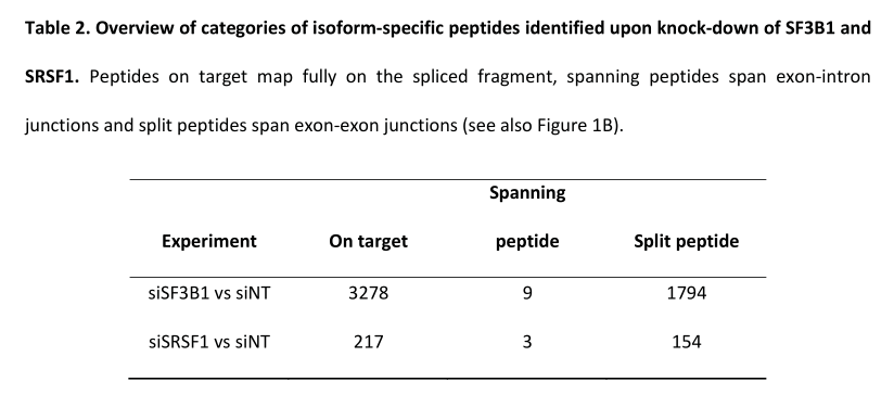肽段數(shù)量上的差別直接和兩個實驗剪接isoform數(shù)據(jù)庫的數(shù)目相關(guān)。總的來說,大約60%的isoform特異肽段會比對到目標(biāo)區(qū)域,跨越exon-econ junction的split 肽段約占40%,跨越 exon-intron junctions 的spanning肽段則很少被發(fā)現(xiàn)(如表2所示)。