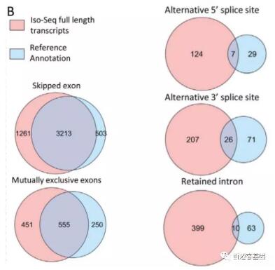 在研究可變剪接方面,Iso-Seq測到的全長轉(zhuǎn)錄本對基因組注釋結(jié)果是一個極大補充,尤其在內(nèi)含子保留、3 ‘可變剪接和5 ‘端可變剪接事件中,Iso-Seq測到的全長轉(zhuǎn)錄本與基因組注釋的重疊較小。這表明,基因組注釋中缺少一些完整的或部分的內(nèi)含子序列可變剪接的isoform形式。