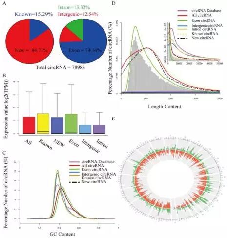 所有circRNA和外顯子circRNA的GC含量高于circRNA數(shù)據(jù)庫,但內(nèi)含子和基因間區(qū)circRNA的GC含量與circRNA數(shù)據(jù)庫中相似(圖2c)。此外,circRNA長度的峰值主要集中在558 bp區(qū)域,而在數(shù)據(jù)庫中circRNA的峰值則集中在4105 bp區(qū)域。新circRNA與已知的circRNA長度具有相似的特征,表明新circRNA數(shù)據(jù)是可靠的(圖2d)。圖2e顯示了circRNA在人類染色體上的基因分布,circRNA也廣泛分布于所有的染色體中,但在Y染色體和著絲粒上的分布較少,在每條染色體的染色體臂兩端有較高的分布。