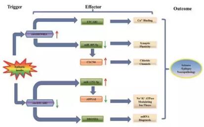 最近的基因組學研究揭示了許多與各種疾病的基因調(diào)控相關(guān)的非編碼RNA (ncRNAs)。人類癲癇中非編碼RNA的表達也發(fā)生了改變,可以作為一種新的、非侵入性的生物標志物來改善目前的癲癇診斷。環(huán)狀RNA (circRNAs)是一種獨特的非編碼環(huán)狀RNA,circRNA與microRNAs (miRNAs)相互作用,并作為miRNA海綿,通過circRNA-miRNA-mRNA網(wǎng)絡(luò)在神經(jīng)系統(tǒng)疾病中調(diào)節(jié)基因表達。研究表明環(huán)狀RNA在神經(jīng)元功能中發(fā)揮重要作用,尤其是在突觸中。組織學研究結(jié)果證實,邊緣系統(tǒng)的突觸重組似乎能逐漸增強皮質(zhì)興奮性,并可能導(dǎo)致癲癇發(fā)作。然而,circRNAs在癲癇中的作用仍是未知的。
