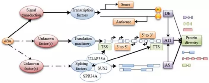 FY Zhu[3]等通過轉錄組和蛋白組的聯(lián)合分析揭示了擬南芥在脫落酸響應中的可變剪接和翻譯的分子機制,結果中發(fā)現(xiàn)相比于基因的差異表達,發(fā)生差異可變剪接的基因功能多集中在三羧酸循環(huán)、光合作用等途徑,表明在對ABA響應中,相對基因表達,轉錄本的結構變化可能起更為重要的作用,且差異可變剪接事件更容易翻譯成蛋白行使生物學功能。