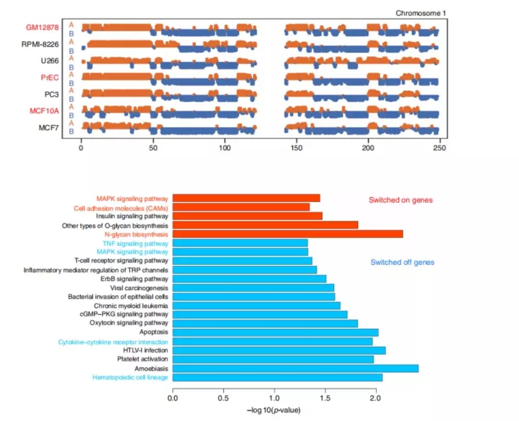 例如在人的多發(fā)性骨髓瘤文章中,作者利用正常B細(xì)胞(GM12878)和兩種亞型的骨髓瘤細(xì)胞(近二倍體U266和近三倍體RPMI-8226)進(jìn)行Hi-C、WGS和RNA-seq測(cè)序,結(jié)果發(fā)現(xiàn),相比于GM12878,U266和RPMI-8226癌癥細(xì)胞中6%的區(qū)域均存在B轉(zhuǎn)換到A,1%的區(qū)域均存在A轉(zhuǎn)換到B,結(jié)合RNA-seq數(shù)據(jù),發(fā)現(xiàn)B轉(zhuǎn)換到A區(qū)域內(nèi)的基因變成轉(zhuǎn)錄活躍狀態(tài),而A轉(zhuǎn)換到B區(qū)域內(nèi)的基因變成轉(zhuǎn)錄抑制狀態(tài),KEGG富集通路發(fā)現(xiàn)這些基因與多發(fā)性骨髓瘤相關(guān),主要涉及MAPK信號(hào)轉(zhuǎn)導(dǎo)途徑、TNF信號(hào)轉(zhuǎn)導(dǎo)途徑、細(xì)胞因子和細(xì)胞因子受體相互作用途徑等,進(jìn)一步在染色體2q11.2-q12.142處發(fā)現(xiàn)一個(gè)細(xì)胞因子基因簇,幾種白細(xì)胞介素IL1R1,IL1R2,IL18R1和細(xì)胞因子MAP4K4下調(diào)表達(dá),這些基因在后續(xù)研究中重點(diǎn)關(guān)注。