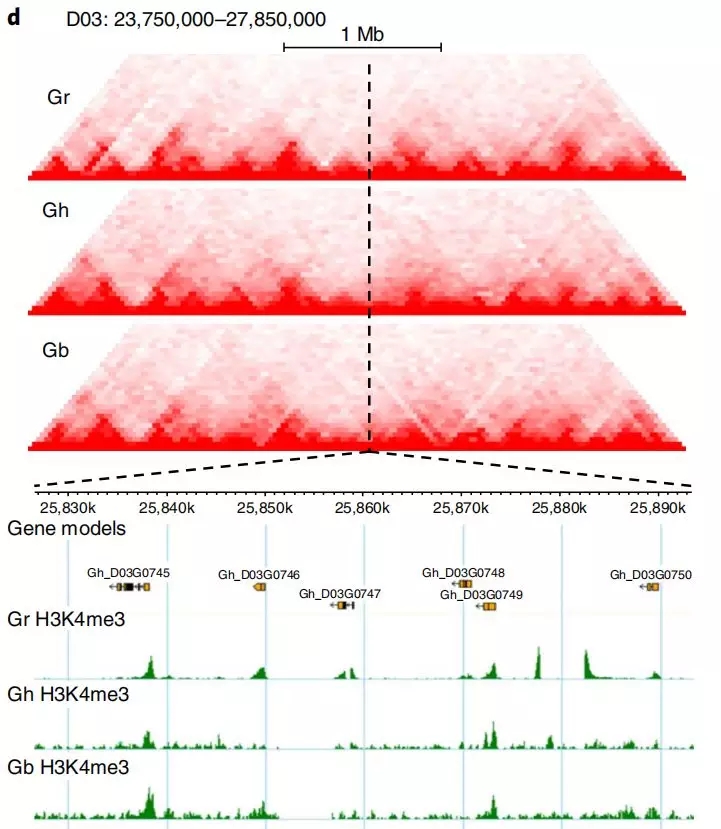 例如,在棉花的三維基因組進(jìn)化文章中,作者對(duì)二倍體雷蒙德氏棉、二倍體亞洲棉、四倍體陸地棉和四倍體海島棉構(gòu)建了三維基因組圖譜,與雷蒙德氏棉D(zhuǎn)03染色體相比,陸地棉和海島棉對(duì)應(yīng)的D亞基因組中發(fā)生了染色質(zhì)重排,虛線對(duì)應(yīng)的TAD結(jié)構(gòu)發(fā)生了變化,雷蒙德氏棉中該TAD結(jié)構(gòu)完整,存在明顯的邊界,陸地棉中該邊界發(fā)生了左移,而海島棉中該TAD趨向于消失。因而通過(guò)鑒定TAD發(fā)生變化區(qū)域的基因,可以研究多倍化過(guò)程中基因表達(dá)調(diào)控的改變(研究多倍體的老師們,這可是一個(gè)很好的套路文章哦)。同時(shí)結(jié)合ChIP-seq數(shù)據(jù)對(duì)該TAD邊界進(jìn)行分析發(fā)現(xiàn),雷蒙德氏棉富含豐富的H3K4me3(活性染色質(zhì)標(biāo)記),而陸地棉和海島棉中H3K4me3顯著減少,說(shuō)明在棉花的多倍化與表觀遺傳修飾存在密切關(guān)聯(lián)。