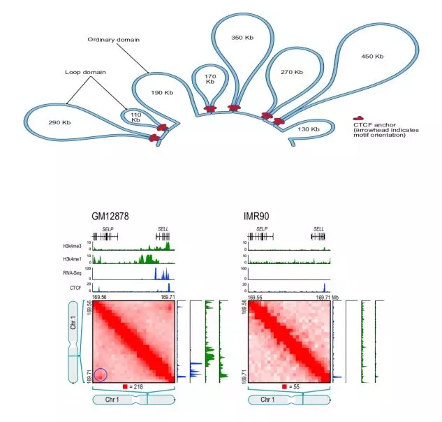 例如,在人的loop文章中,作者在GM12878細(xì)胞系發(fā)現(xiàn)9448個(gè)loop,其中2854個(gè)loop與已知的啟動(dòng)子-增強(qiáng)子作用相關(guān),基因的啟動(dòng)子存在loop比不存在loop時(shí)的表達(dá)量顯著增加。GM12878細(xì)胞系中存在一個(gè)Loop,這個(gè)Loop連接了SELL啟動(dòng)子和一個(gè)遠(yuǎn)端增強(qiáng)子SELP,基因開(kāi)啟轉(zhuǎn)錄,表達(dá)量增加,而IMR90細(xì)胞系中沒(méi)有這個(gè)Loop,基因不表達(dá)。