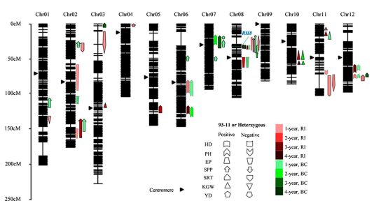 研究人員對多個雜交水稻組合的產(chǎn)量優(yōu)勢性狀進行多年、多地點的綜合分析發(fā)現(xiàn):每穗小花數(shù)和有效穗數(shù)是造成兩系雜交稻產(chǎn)量優(yōu)勢的主要原因,而且前者有超親優(yōu)勢,后者只有超父本優(yōu)勢。之后對源自LYP9后代的每個重組自交系(RIL)群體進行重測序的基礎上,構(gòu)建了一張高分辨率的遺傳連鎖圖,并利用RIL群體及其與母本回交的RILBC1群體進行產(chǎn)量相關(guān)性狀的遺傳定位,鑒定了一系列產(chǎn)量及其他優(yōu)勢相關(guān)性狀的QTL位點。同時,結(jié)合對幼穗發(fā)育早期的轉(zhuǎn)錄組分析以及QTL定位的結(jié)果,確定了多個與雜種優(yōu)勢相關(guān)候選基因。此外,還對一個產(chǎn)量雜種優(yōu)勢的主效位點進行了圖位克隆,發(fā)現(xiàn)rice heterosis 8 (RH8) 位點實際上是由DTH8/Ghd8/LHD1編碼的光周期調(diào)控的節(jié)律基因,它同時控制開花期、株高、分蘗數(shù),每穗小花數(shù)等多種性狀。隨后對361份雜交稻(其中包括125份二系雜交稻)的基因型解析后發(fā)現(xiàn),RH8的雜合性是兩系法雜交稻基因型的主要類型。