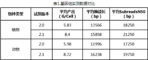 ? ? ? 選取動物和植物樣本分別構建20K文庫,并對文庫進行升級前后的平行實測。從數(shù)據(jù)產(chǎn)出的對比可以看出,較升級前的6-8G/Cell的平均產(chǎn)出,2.1版本試劑單個Cell的平均產(chǎn)出有2.5G以上的提升,并且subreads?N50長度亦有2K以上的提升。這就意味著可以用更少的Cell得到更多且更長的數(shù)據(jù)。當然這些數(shù)據(jù)亦可有效提基因組的組裝和拼接。