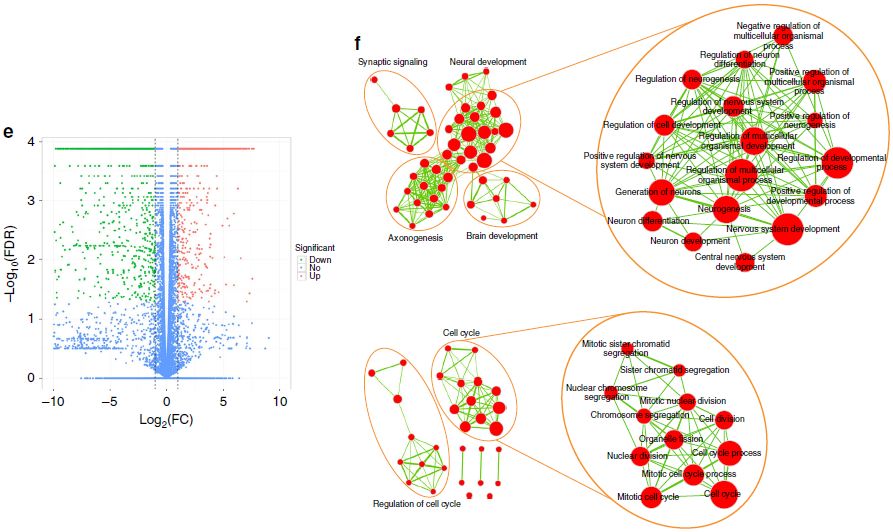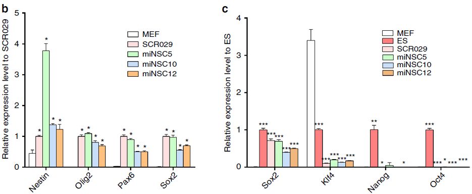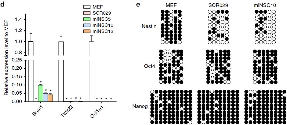 為了進(jìn)一步確認(rèn)這些miNSC的NSC身份,作者對miNSC10、SCR029和MEF細(xì)胞進(jìn)行了RNA-seq分析。miNSC10、SCR029和MEF細(xì)胞中基因表達(dá)水平的散點(diǎn)圖顯示,miNSC10和SCR209細(xì)胞的基因表達(dá)水平相似,但均與MEF存在顯著差異(圖3a-c)。與這些結(jié)果一致的是,聚類分析也顯示出miNSC10和SCR029細(xì)胞之間有很高的相似性,但它們與MEF之間有很大的差異(圖3d)。與MEF相比,miNSC中有許多基因表達(dá)水平下調(diào)或上調(diào)(圖3e)。作者對上調(diào)基因進(jìn)行基因集富集分析(GSEA),發(fā)現(xiàn)了兩組主要的富集基因GO term(圖3f)。其中一組在與神經(jīng)發(fā)育相關(guān)的GO term中富集,如神經(jīng)發(fā)生、神經(jīng)元分化、神經(jīng)系統(tǒng)發(fā)育、神經(jīng)發(fā)生調(diào)節(jié)、大腦發(fā)育和軸突發(fā)生。另一組富集在細(xì)胞分裂GO term,包括細(xì)胞分裂、有絲分裂細(xì)胞周期、核分裂、姐妹染色單體分離、細(xì)胞周期調(diào)控。這些數(shù)據(jù)與miNSC作為NSC及其增殖和自我更新能力是一致的。與此一致的是,進(jìn)一步的分析顯示,盡管有一定的差異,但miNSC10、SCR029、NS528(小鼠ES細(xì)胞來源的NSC)和ciNSC10 (化學(xué)誘導(dǎo)MEF形成的NSC)細(xì)胞之間的相似性比MEF更大。