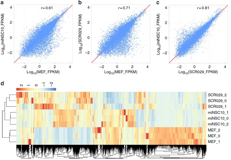 材料:35000個(gè)MEF細(xì)胞,50,000個(gè)miNSC10細(xì)胞,50,000個(gè)SCR029細(xì)胞。測序平臺(tái):Illumina HiSeq X Ten。