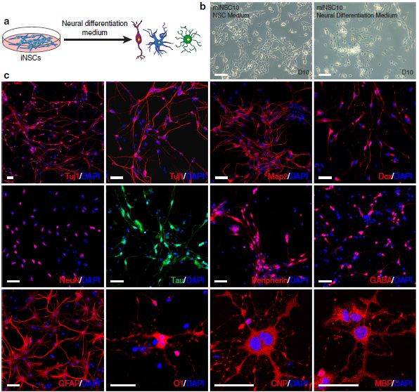作者想要解決的問題是由非神經(jīng)前體細(xì)胞TF Ptf1a重編程的miNSC是否可以與NSC 一樣,具有分化成神經(jīng)元、星形膠質(zhì)細(xì)胞和少突膠質(zhì)細(xì)胞的潛力(圖4a)。當(dāng)在神經(jīng)分化培養(yǎng)基中培養(yǎng)時(shí),短短幾天內(nèi),miNSC就發(fā)生了穩(wěn)健的形態(tài)學(xué)變化,細(xì)胞體積變小、普遍的神經(jīng)突擴(kuò)張(圖4b)。在培養(yǎng)的2-3周,許多細(xì)胞分化為Tuj1、Map2、Dcx、NeuN、Tau、peripherin或GABA免疫的神經(jīng)元(圖4c)。3周時(shí)的定量顯示,83.3%的細(xì)胞呈Tuj1陽性(圖4e)。此外,不同miNSC細(xì)胞系(miNSC5、10、12)顯示類似的分化成Tuj1或Map2免疫的神經(jīng)元的能力(補(bǔ)充圖8)。在星形膠質(zhì)細(xì)胞分化條件下,87.2%的分化細(xì)胞形成神經(jīng)膠質(zhì)原纖維酸性蛋白(GFAP)免疫的星形膠質(zhì)細(xì)胞(圖4 c,e),少突膠質(zhì)細(xì)胞分化培養(yǎng)基中,miNSC能夠分化為O1、CNP或MBP免疫的少突膠質(zhì)細(xì)胞,而26.6%的分化細(xì)胞為O1陽性(圖4 c,e)。因此,ptf1a重編程的miNSC具有三能性,能夠分化為神經(jīng)元、星形膠質(zhì)細(xì)胞和少突膠質(zhì)細(xì)胞。
