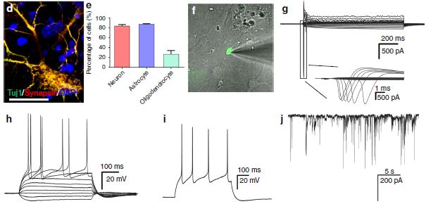 根據(jù)qRT-PCR結(jié)果,ptf1a重編程的hiNSC幾乎不表達(dá)多能性基因OCT4和NANOG。相反,它們高表達(dá)NSC標(biāo)志蛋白,包括SOX2、PAX6、NESTIN、OLIG2和FABP7(圖9 e-i)。體外分化試驗(yàn)表明hiNSC具有三能性(圖9p,j-n)因此,Ptf1a具有類似的活性,可將人類成纖維細(xì)胞重編程形成三能性NSC。作者通過突觸素染色標(biāo)記試驗(yàn)、電生理特性分析表明,ptf1a重編程的miNSC能夠分化為功能神經(jīng)元(圖9q,r-u)。