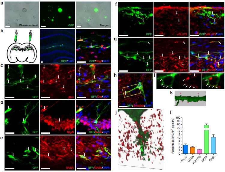 作者進(jìn)一步研究了ptf1a重編程hiNSC在體內(nèi)分化成神經(jīng)和膠質(zhì)細(xì)胞系的潛力。將帶GFP標(biāo)記的hiNSC移植到成年小鼠海馬區(qū),發(fā)現(xiàn)ptf1a重編程的hiNSC在體外和體內(nèi)都具有分化成神經(jīng)和膠質(zhì)細(xì)胞系的多能性。