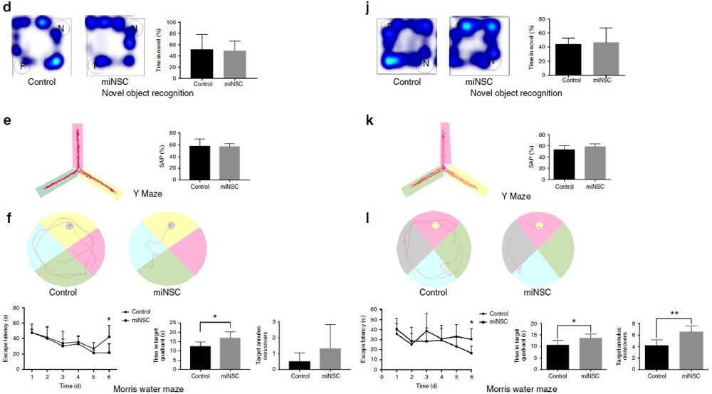 作者也評估了miNSC對β-淀粉樣蛋白1-40(Aβ1-40)損傷AD小鼠模型的治療潛力。首先確定了Aβ1-40損傷小鼠的學(xué)習(xí)和記憶障礙小鼠與AD類似。將GFP標(biāo)記的miNSC在注射Aβ1-40 2周后移植到相同位置。兩個(gè)月后,作者進(jìn)行了同樣的行為學(xué)試驗(yàn),發(fā)現(xiàn)移植miNSC可以顯著提高APP / PS1和Aβ1-40損傷AD小鼠模型的空間學(xué)習(xí)和記憶能力,療效與ESC來源的NSC相似(圖6g-k)。