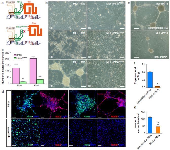 先前有研究表明,Ptf1a與Rbpj、E-蛋白以非Notch信號(hào)依賴性方式形成DNA結(jié)合三聚體,以特化胰腺細(xì)胞系和GABA能神經(jīng)元。作者研究了Ptf1a和Rbpj之間非Notch信號(hào)依賴性的互作是否也是Ptf1a重編程所需要的。在MEF中,WB和免疫共沉淀結(jié)果顯示,Rbpj蛋白是內(nèi)源性表達(dá),外源性表達(dá)的Ptf1a可以免疫共沉淀Rbpj。將Dox可誘導(dǎo)的 Ptf1aW298A(此突變體中Ptf1a與Rbpj的互作被破壞,但仍可與E-蛋白結(jié)合)慢病毒注射到MEF中,在注射6天后,沒有發(fā)生典型形態(tài)變化以形成細(xì)胞群落,只在9—14天產(chǎn)生了少數(shù)類似正常形態(tài)神經(jīng)球的群落,而注射了野生型Ptf1a病毒的MEF則在在9—14天,在12孔板中每板產(chǎn)生了數(shù)以百計(jì)的神經(jīng)球(圖7 b,c)。類似地,MEF感染Ptf1aW298A慢病毒后未能表達(dá)NSC標(biāo)志蛋白質(zhì)Sox2、Pax6或Nestin(圖7 d)。因此,與Rbpj的互作是Ptf1a重編程的先決條件。與此一致的是,敲除MEF中Rbpj的表達(dá)后,ptf1a誘導(dǎo)的神經(jīng)球的數(shù)量減少了兩倍多(圖7e-g)。