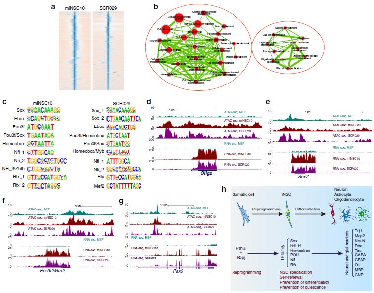 miNSC10 iNSC和SCR029 NSC的ATAC-seq結(jié)果表明,peak關(guān)聯(lián)基因富集在神經(jīng)發(fā)生、神經(jīng)元發(fā)育、大腦發(fā)育、膠質(zhì)細(xì)胞發(fā)育(圖8a, b),與NSC特征一致。在peak峰值中心300 bp窗口中鑒定新motif,說明miNSC10和SCR029細(xì)胞都富集了類似的屬于多個(gè)TF家族的TF結(jié)合motif,TF家族包括Sox、bHLH (Ebox)、Pou3f、homeobox、Nfi和Rfx(圖8c)。相應(yīng)地,RNA-seq數(shù)據(jù)顯示,與MEF相比,這些TF基因家族的多個(gè)成員在miNSC10和SCR029細(xì)胞中上調(diào)或高表達(dá)。qRT-PCR證明,除了Sox2之外,Sox5、6、8、21在miNSC10和SCR029細(xì)胞中均表達(dá)上調(diào)。一般來說,miNSC10細(xì)胞的ATAC-seq圖譜與SCR029細(xì)胞相似,但與MEF完全不同;而對于上調(diào)的TF基因,如Olig2(bHLH)、Sox2、Pou3f2/Brn2、Pax6 (homeobox),與MEF相比,miNSC10和SCR029細(xì)胞中這些位點(diǎn)具有更多的峰和/或差異峰(圖8d-g),說明更開放的染色質(zhì)結(jié)構(gòu)增加了基因表達(dá)。