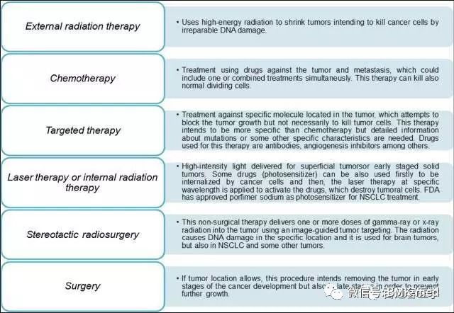 高強(qiáng)度射線照射表淺腫瘤或早期實體性腫瘤??墒紫葢?yīng)用某些藥物(如光敏劑),使其進(jìn)入腫瘤細(xì)胞后再應(yīng)用特定波長的微波進(jìn)行激光治療、?激活這些藥物從而破壞腫瘤細(xì)胞。FDA已批準(zhǔn)卟吩姆鈉(porfimer?sodium)用作NSCLC治療的光敏劑;