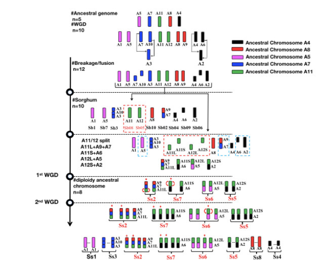 AP85-441基因組的組裝顯示了S.spontaneum的染色體數(shù)目從10降到8,而這與頻繁復(fù)制的古復(fù)制染色體對(duì)相關(guān),通過與高粱的聚類比對(duì),發(fā)現(xiàn)高粱祖先5染色體和8號(hào)染色體同源物經(jīng)歷了染色體裂變(圖2)。SbChr05(A12)的祖先染色體斷裂分為兩個(gè)主要部分,即C5S(A12S)和C5L(A12L),分別轉(zhuǎn)移到SbChr06(A2)和SbChr07(A5)的祖先染色體;SbChr8(A11)的祖先染色體斷裂為兩個(gè)主要的部分,即C8S(A11S)和C8L(A11L),分別轉(zhuǎn)移到SbChr09(A6)和SbChr02(A7+ A9)的祖先染色體中。SbChr8和SsChr5之間及SbChr5和SsChr7之間近乎同源的短片段是在高粱與甘蔗分化前,高粱SSA形成于13.4MYA同源基因的殘留物,同時(shí)發(fā)現(xiàn),S5中較小的SSA區(qū)域和S8中SSA的較大區(qū)域在重排的AP85-441基因組中也是保守的。