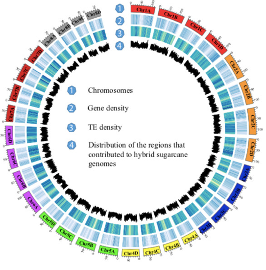 利用BAC文庫(kù)進(jìn)行二代測(cè)序,ALLPATH-LG,SPAdes 和SOAPdenovo2進(jìn)行初步組裝,進(jìn)一步利用87X 三代PacBio數(shù)據(jù)進(jìn)行糾錯(cuò),CANU進(jìn)行組裝,組裝基因組3.13G,contigN50=45 kb(流式評(píng)估基因組大?。?.36G);通過Hi-C染色體掛載技術(shù),針對(duì)多倍體染色掛載新算法ALLHIC,進(jìn)一步將contig水平提升至染色體水平,掛載率達(dá)到93%;通過BUSCO和二代數(shù)據(jù)回比評(píng)估基因組完整性高達(dá)97.3%。再通過MAKER對(duì)同源多倍體甘蔗特異等位基因進(jìn)行手動(dòng)注釋,以獲得高質(zhì)量的甘蔗基因組