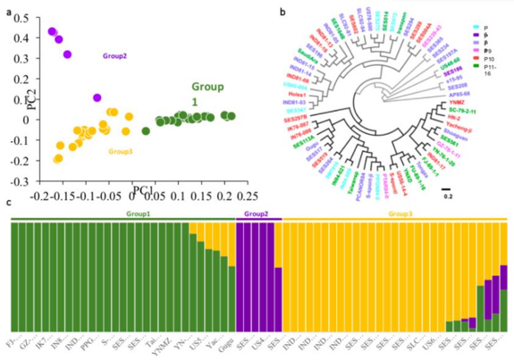 通過對(duì)64份甘蔗(Saccharum spontaneum)群體材料遺傳多樣性研究,發(fā)現(xiàn)其具有廣泛的自然部分范圍,遍及亞洲,印度次大陸,地中海和非洲,且自然種群具有廣泛的表型,遺傳和倍性水平多樣性(圖4)。研究發(fā)現(xiàn),與高粱相比具有大規(guī)模染色體重排的S. spontaneum區(qū)域具有比非重排區(qū)域更高的遺傳多樣性,并且可能經(jīng)歷了更強(qiáng)的平衡選擇。雖然幾條單獨(dú)的染色體沒有顯示出顯著差異,但是比較所有染色體上的平均值顯示重排區(qū)域中的核苷酸多樣性(0.00025±0.00003)遠(yuǎn)高于非重排區(qū)域中的核苷酸多樣性(0.00021±0.00001),染色體重排區(qū)域的Tajima’s D(-0.659±0.052)遠(yuǎn)遠(yuǎn)高于非重排區(qū)(-0.720±0.011),重排區(qū)的SNP密度(360.27±48.41) 高于非重排區(qū)域(297.46±12.65, P=0.001798);此外,GO富集顯示,染色體非重排區(qū)主要富集到與基本生命周期,光合作用,呼吸作用和ATP合成的通路上。重排區(qū)主要富集在GO生物合成和代謝,跨膜轉(zhuǎn)運(yùn)和離子結(jié)合通路上。