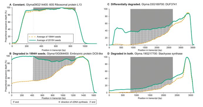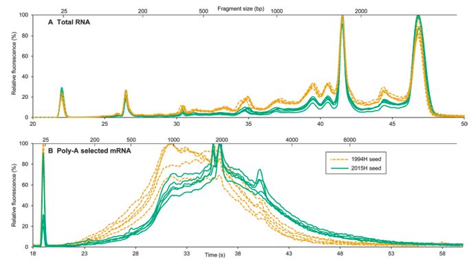 在相隔21年的種子的胚軸中比較mRNA的降解,2015H和1994H分別顯示未衰老和增加衰老癥狀。使用全分子cDNA無打斷的測序方法對RNA進(jìn)行測序。發(fā)現(xiàn)一些轉(zhuǎn)錄本在兩個(gè)群組中均有降解,但在1994H種子的組織中觀察到更多的損傷。損傷主要由于片段碎裂造成,如電泳圖譜的變化,轉(zhuǎn)錄本覆蓋長度和測序深度所示。幾乎沒有證據(jù)表明轉(zhuǎn)錄本丟失或引起了氧化損傷。降解轉(zhuǎn)錄本中片段大小的連續(xù)分布以及轉(zhuǎn)錄本長度和降解之間的正相關(guān)支持了通過隨機(jī)片段化造成mRNA降解的假設(shè),這與氧化事件引起死亡的假設(shè)一致。