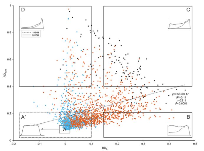 圖3. 比較2015H和1994H每個(gè)位置的轉(zhuǎn)錄本reads之間的平均歸一化測序深度