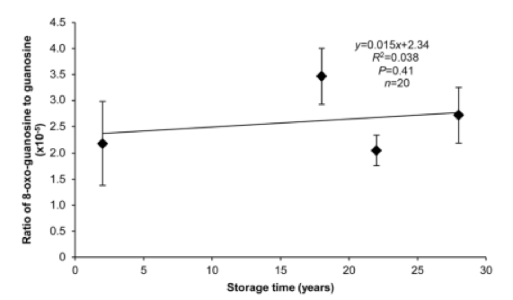 來自5’末端的轉(zhuǎn)錄本降解可以反映年齡相關(guān)的RNA氧化。最容易氧化的堿基,8-oxo-guanosine的豐度與總RNA中鳥苷豐度的比例與1989,1995,1999和2015年收獲的大豆種子胚軸的貯藏時(shí)間無關(guān)(圖5)。