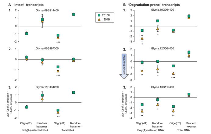 通過qPCR的方法對區(qū)域A(無降解)的三種轉(zhuǎn)錄本和區(qū)域B的三種轉(zhuǎn)錄本(僅在1994H種子組織中顯著降解)的完整性進(jìn)行驗(yàn)證,結(jié)果顯示:區(qū)域A的轉(zhuǎn)錄本,在組內(nèi)cDNA文庫中5’和3’擴(kuò)增的cDNA模板相似,且三個(gè)cDNA文庫ΔCt值沒有差異,樣本2015H和1994H之間有較小差異。與完整轉(zhuǎn)錄本相反,對于易于降解的轉(zhuǎn)錄本,ΔCt值在群組之間顯著不同(區(qū)域B)。在1994H樣品中,5’比3’擴(kuò)增模板豐度低,產(chǎn)生負(fù)ΔCt值,在2015H樣品中,兩種擴(kuò)增模板豐富度相似。