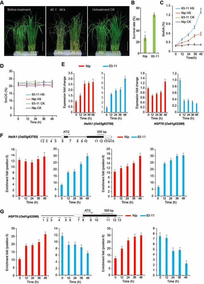 根據(jù)SMRT測序結(jié)果,篩選出候選的6mA修飾的熱脅迫相關(guān)基因,如熱休克轉(zhuǎn)錄因子A1(HsfA1)和熱休克蛋白70(HSP70)。HSFA1是熱脅迫反應(yīng)的主要轉(zhuǎn)錄調(diào)控因子,其在非脅迫條件下受到HSP70的抑制。HSFA1功能缺失導(dǎo)致熱脅迫敏感表型。HsfA1HSP70表達的變化與其6mA水平的變化呈正相關(guān),這可能是Nip和93-11之間熱脅迫耐受性差異的原因。
