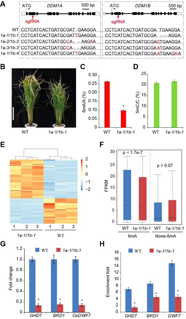 水稻基因組含有兩個DDM1同源基因DDM1aDDM1b,由于功能冗余,只有T-DNA插入單突變體產(chǎn)生的雙突變體DDM1a/1b表現(xiàn)出發(fā)育表型。然而,DDM1a/1b不產(chǎn)生活花粉,導(dǎo)致種子呈空殼和深色。用CRISPR-Cas9對Nip背景中的DDM1aDDM1b進行了有針對性的誘變,并鑒定了10個獨立的T1系用于DDM1aDDM1b單突變和4個獨立的DDM1a/DDM1b(1a/1b)雙突變型。在任何不同類型的DDM1aDDM1b純合子單突變體中均未觀察到表型。與野生型植物相比,所有純合1a/1b系表現(xiàn)出相同的矮化表型。1a-1/1b-1顯示出降低的結(jié)實率,而另外3個雙突變體顯示不育。LC-MS/MS對DNA甲基化水平的定量測量顯示6mA水平顯著降低,但1a/1b植物中5mC水平變化不大。6mA-IPqPCR分析顯示,6mA水平在大多數(shù)隨機選擇的位點中顯著降低。RNA-seq結(jié)果表明野生型中6mA修飾基因的表達水平顯著高于1a-1/1b-1植物中的相同基因,野生型中非6mA基因與1a-1/1b-1植物中的相應(yīng)基因之間沒有表達水平差異。結(jié)果表明6mA水平與基因表達呈正相關(guān)。