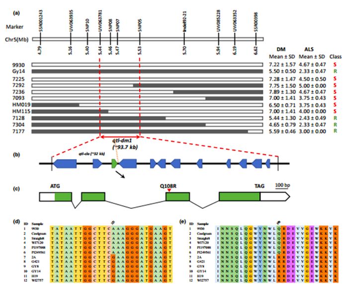 注:a~c為精細定位過程,d為DNA序列比對,e為蛋白質(zhì)序列比對